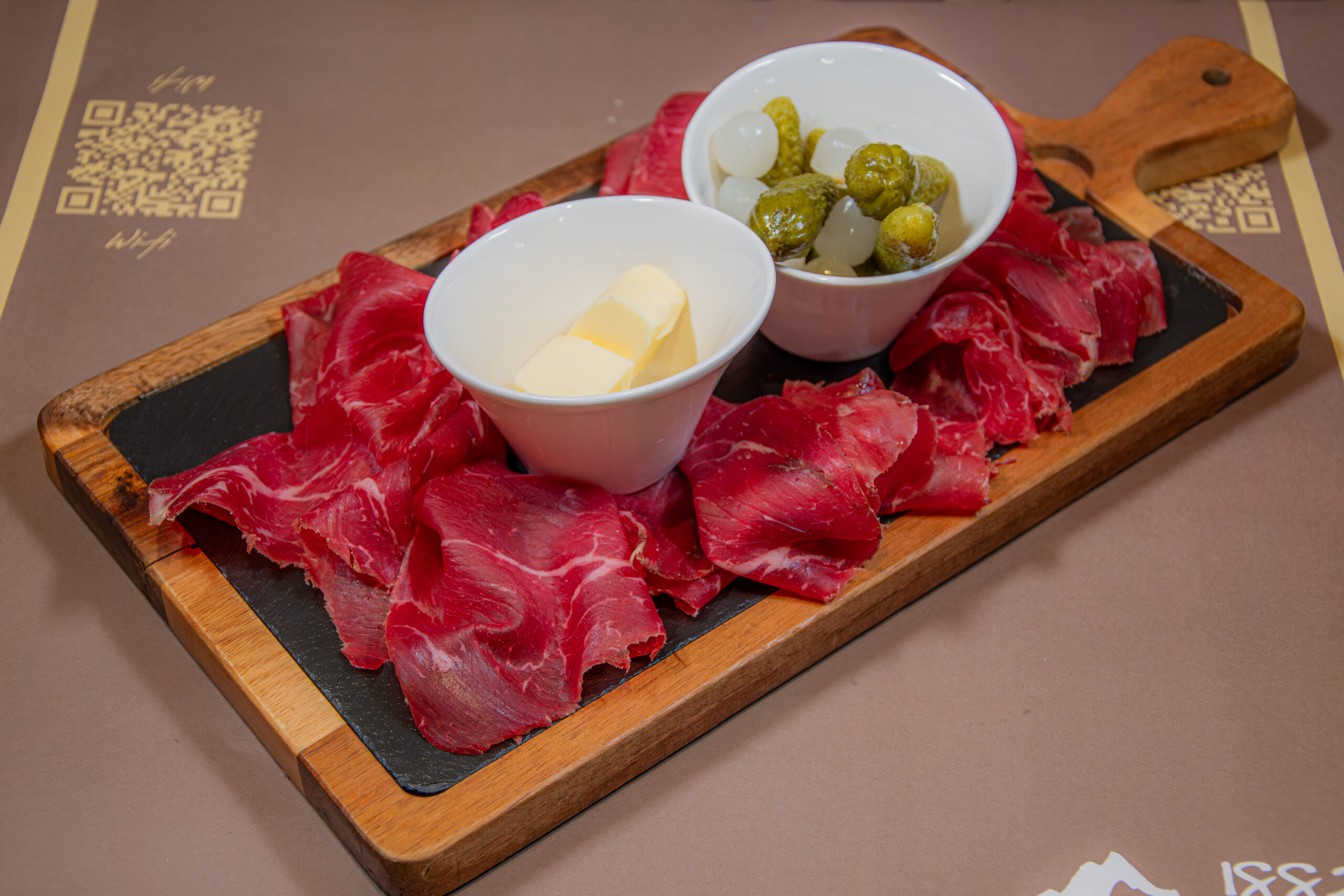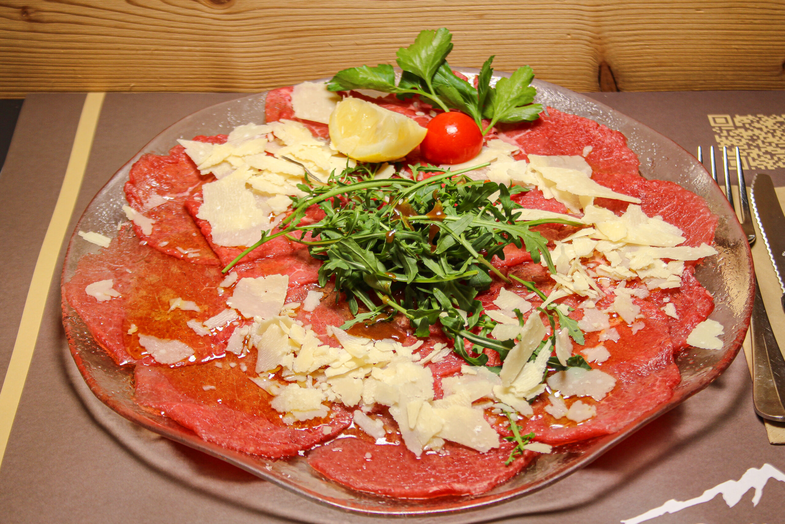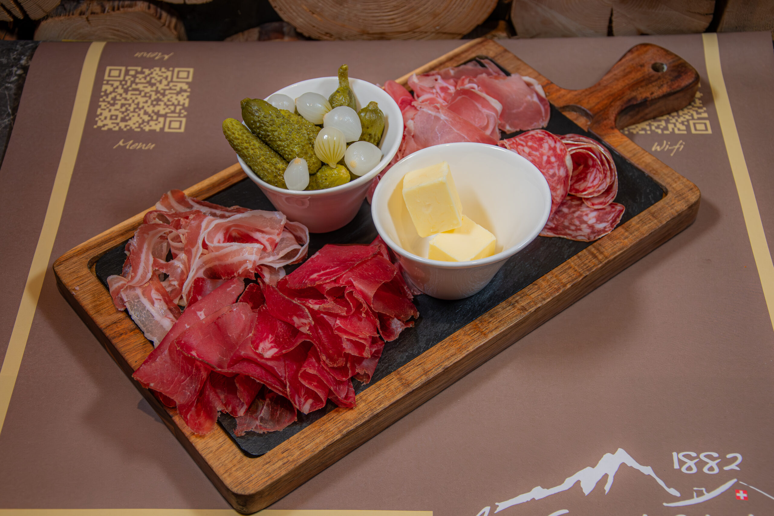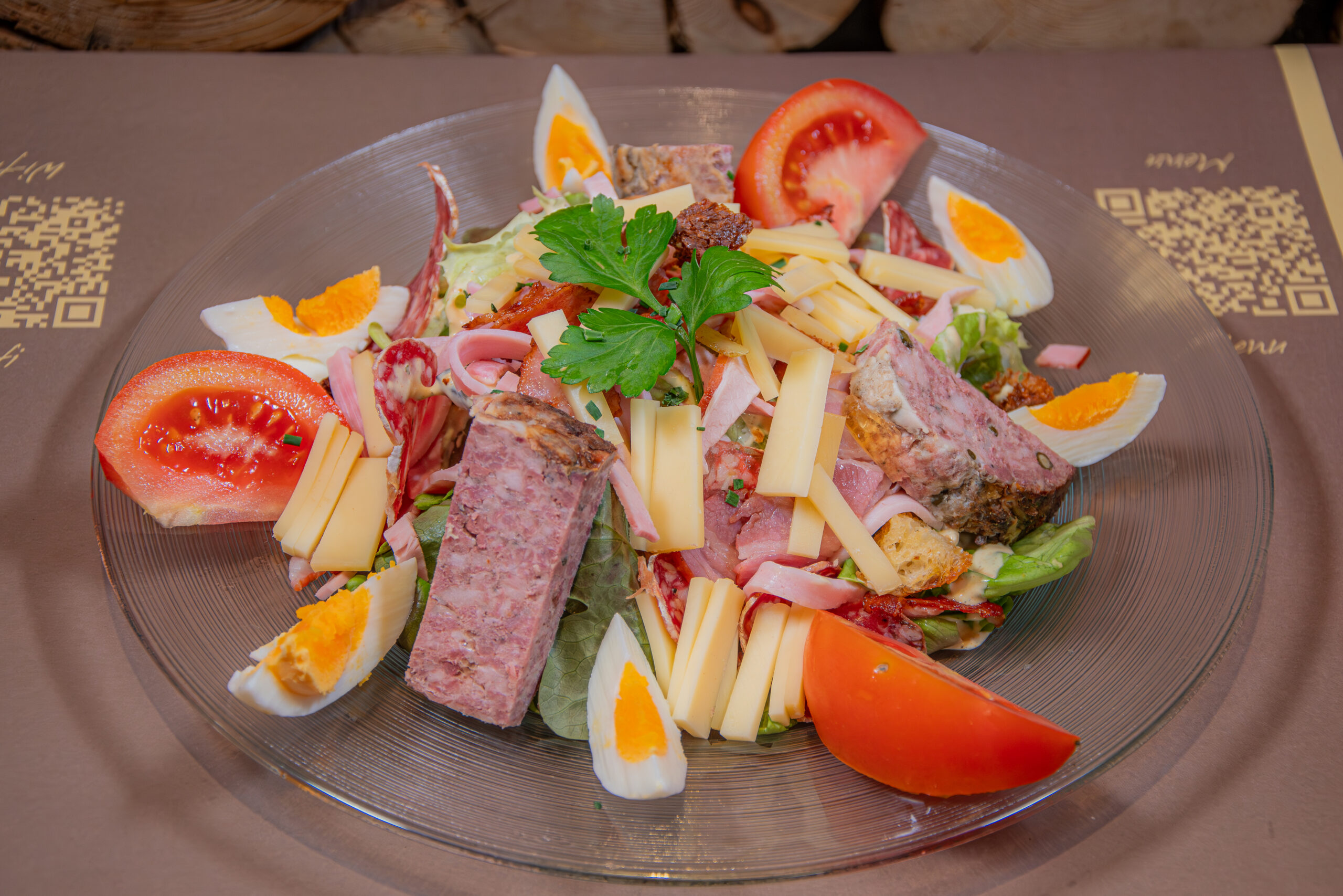 24. -Insalata verde, salsiccia, terrina, prosciutto, Gruyère, pomodori, crostini, pancetta