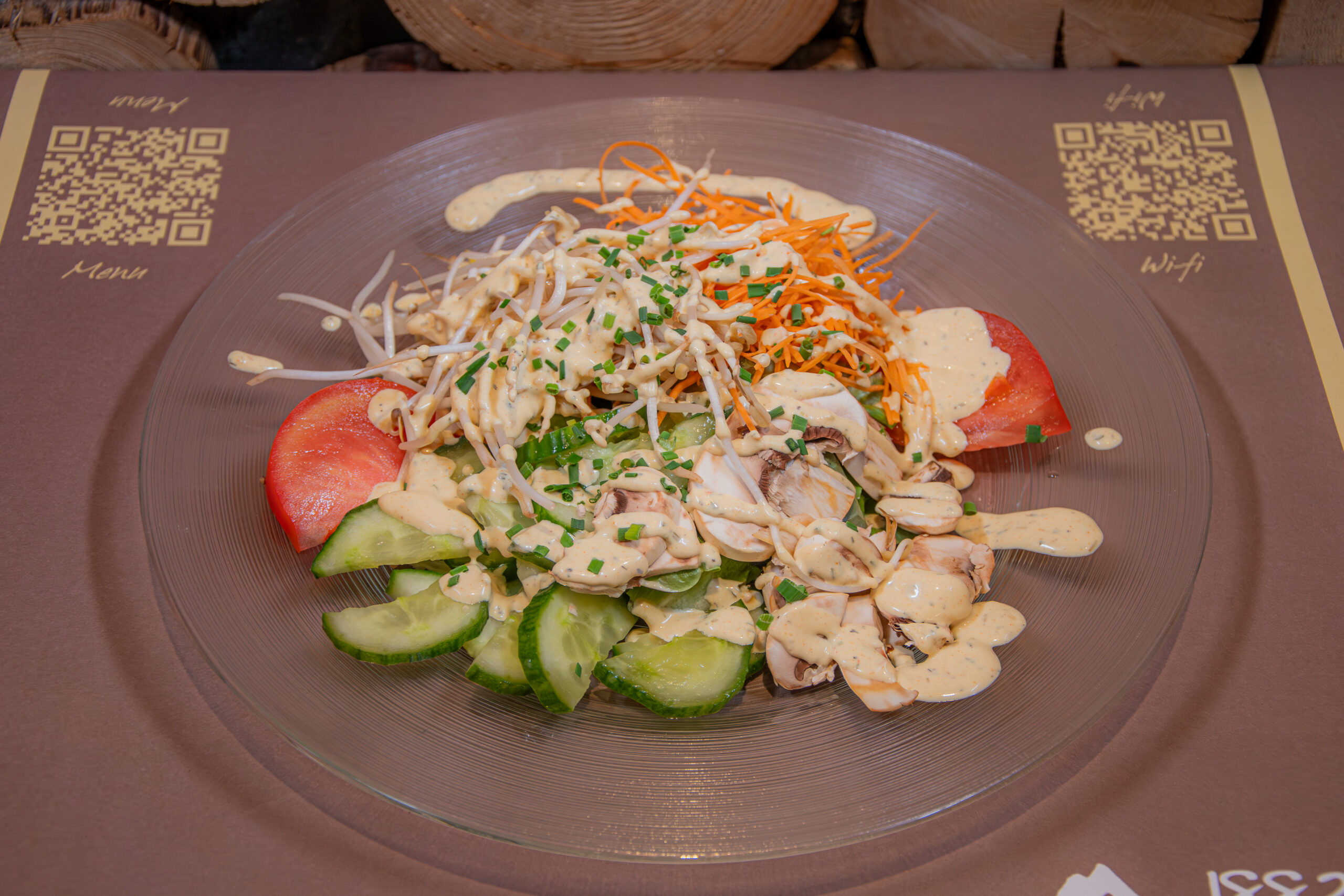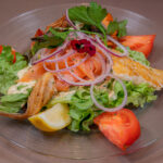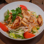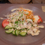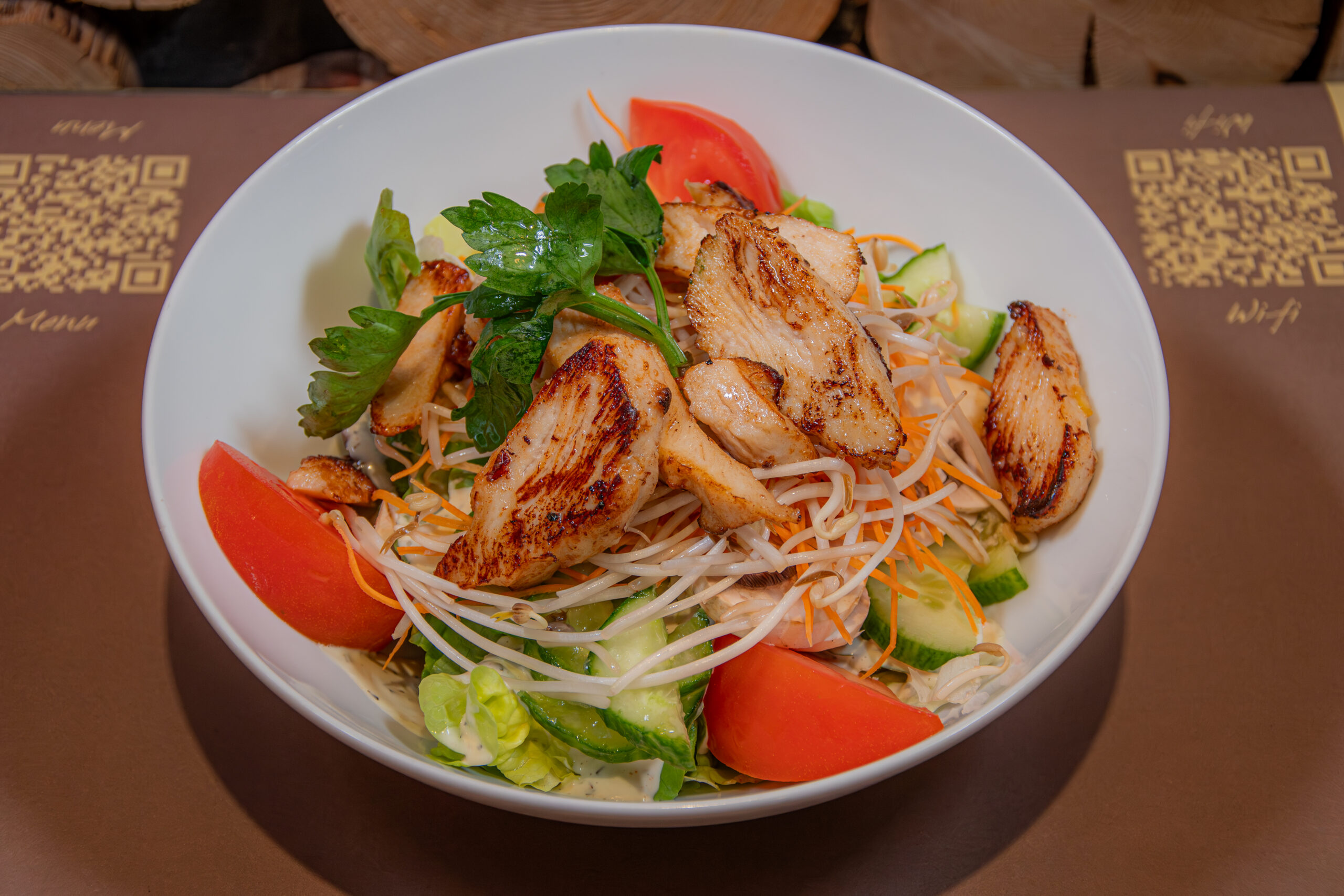22. -Insalata verde, carote, soia, funghi, pomodori, cetrioli, fette di scaloppina di pollo alla griglia