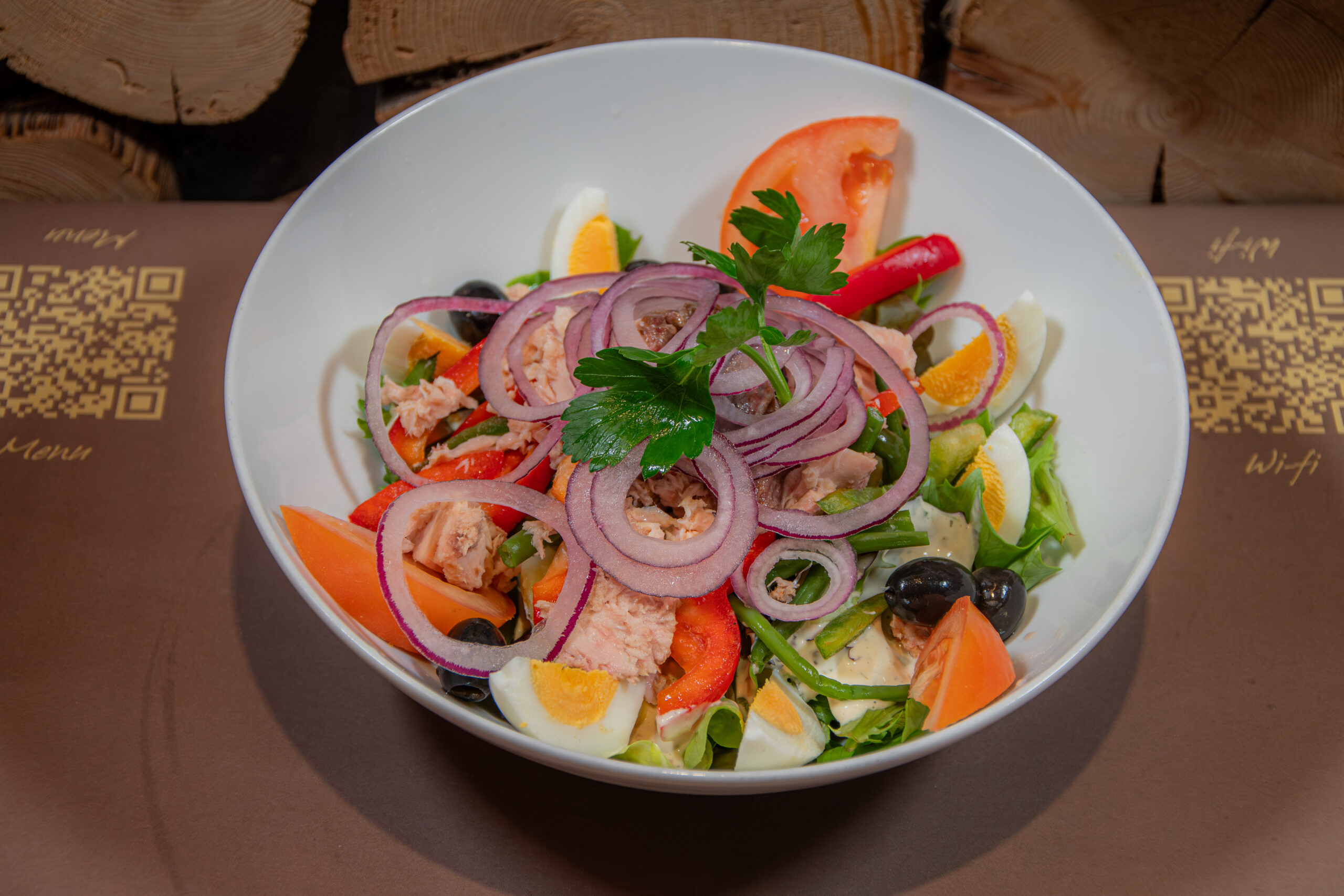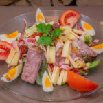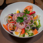 23. -Insalata verde, peperoni, fagiolini, tonno, pomodori, uova, cipolle, olive, acciughe, patate